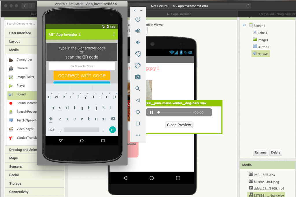 No matter what i did i could not get this to work. This was highly frustrating for me as i never figured it out. I hope i can meet with you so you can give me some guidence on this. What i wanted to be able to accomplish with this app was for the button to be pressed and a sound to play, i was able to do this on the app inventor website but not the emulator itself.
